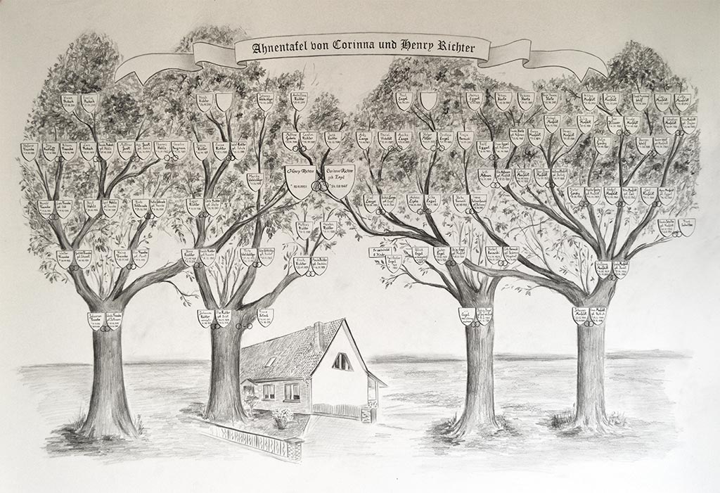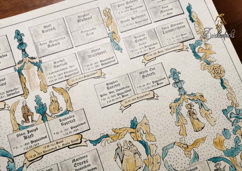 We are often asked whether a tree must be present as a background graphic. The clear answer to this is always no. However, since tree representations make up 95% of our projects, it would be helpful for us to learn at least an approximated style as an alternative to the tree. We are also happy to use reference images that do not depict family trees or pedigrees.