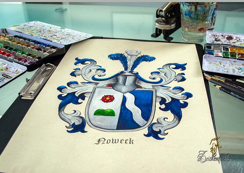 You can work much more finely with watercolor paints than with acrylic paints. We therefore mainly use watercolor paints for coats of arms paintings on our paintings of family trees and pedigree charts.