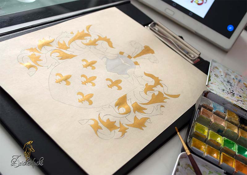 We use both watercolor and acrylic paints for the coat of arms paintings. Both techniques have their advantages and disadvantages.